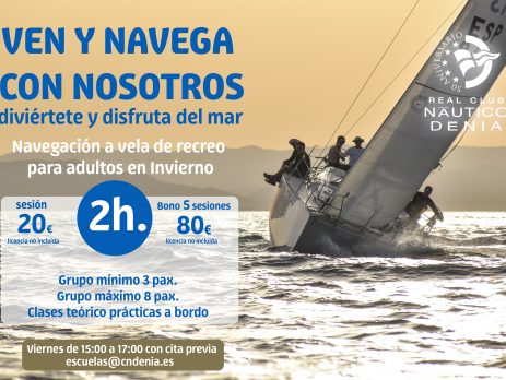 Este mes de Octubre, el RCND realizará todos los viernes sesiones de 2 horas de iniciación a vela, desde las 15:00 h.a 17:00h.. Este curso está orientado a adultos con la intención de aprender a conocer el mar y las actividades náuticas. La actividad no requiere permanencia, pero las plazas serán limitadas y se abriran cada semana hasta completar el aforo. No te pierdas está oportunidad, llama y reserva tu plaza!!!Teléfono: 965 78 09 89 o Email: escuelas@cndenia.es