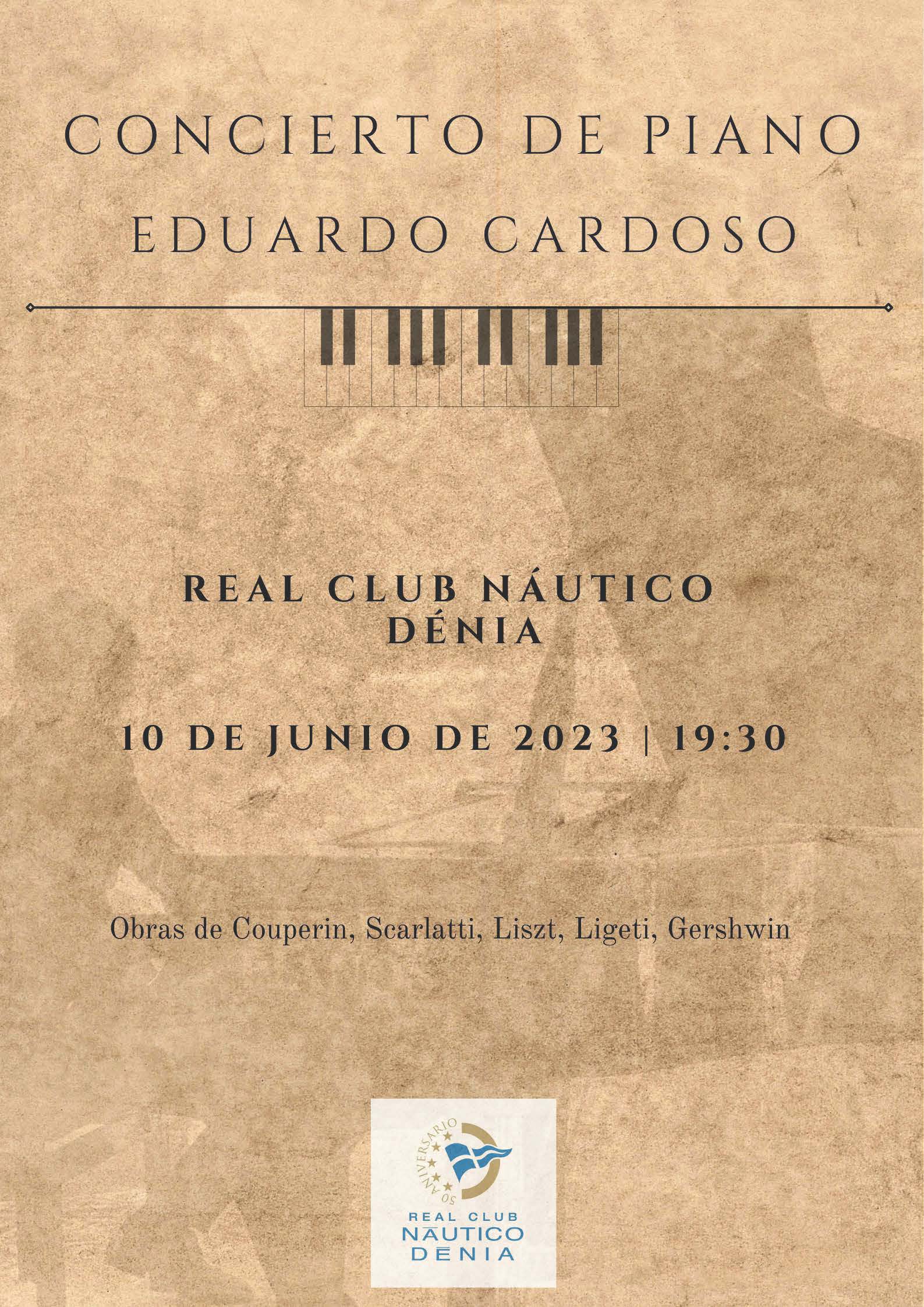 El Real Club Náutico Dénia tiene el placer de invitar a todos los socios a la celebración de un Concierto de Piano a cargo de Eduardo Cardoso. El concierto tendrá lugar a las 19:30 horas en el Salón de actos “Ramón Sauquillo” del Real Club Náutico Dénia.