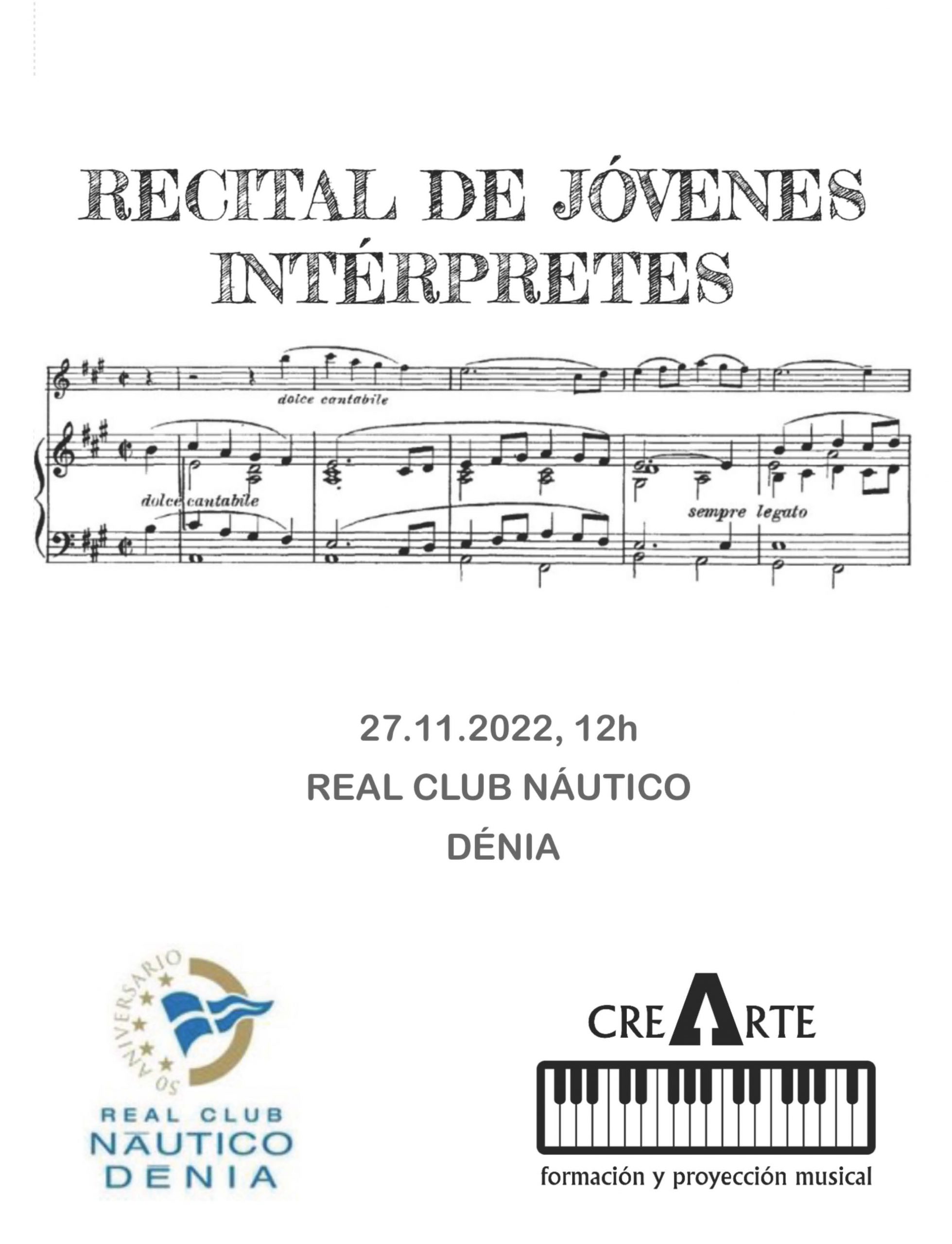 El Proyecto CREARTE creado por Francisco José Perez y Sandra Alfonso, organiza el Recital de Jóvenes Intérpretes de piano, violin y chelo, el próximo domingo 27 de noviembre a las 12:00 horas, en el Salón de actos “Ramón Sauquillo” del Real Club Náutico Dénia. Entrada libre.